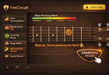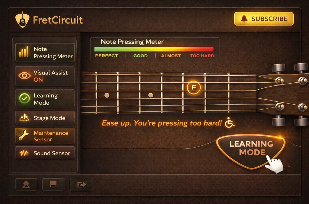 It introduces a patent-pending modular circuitry platform built directly into the guitar neck, allowing plug-and-play assistive modules and companion software — without altering the traditional design musicians love.